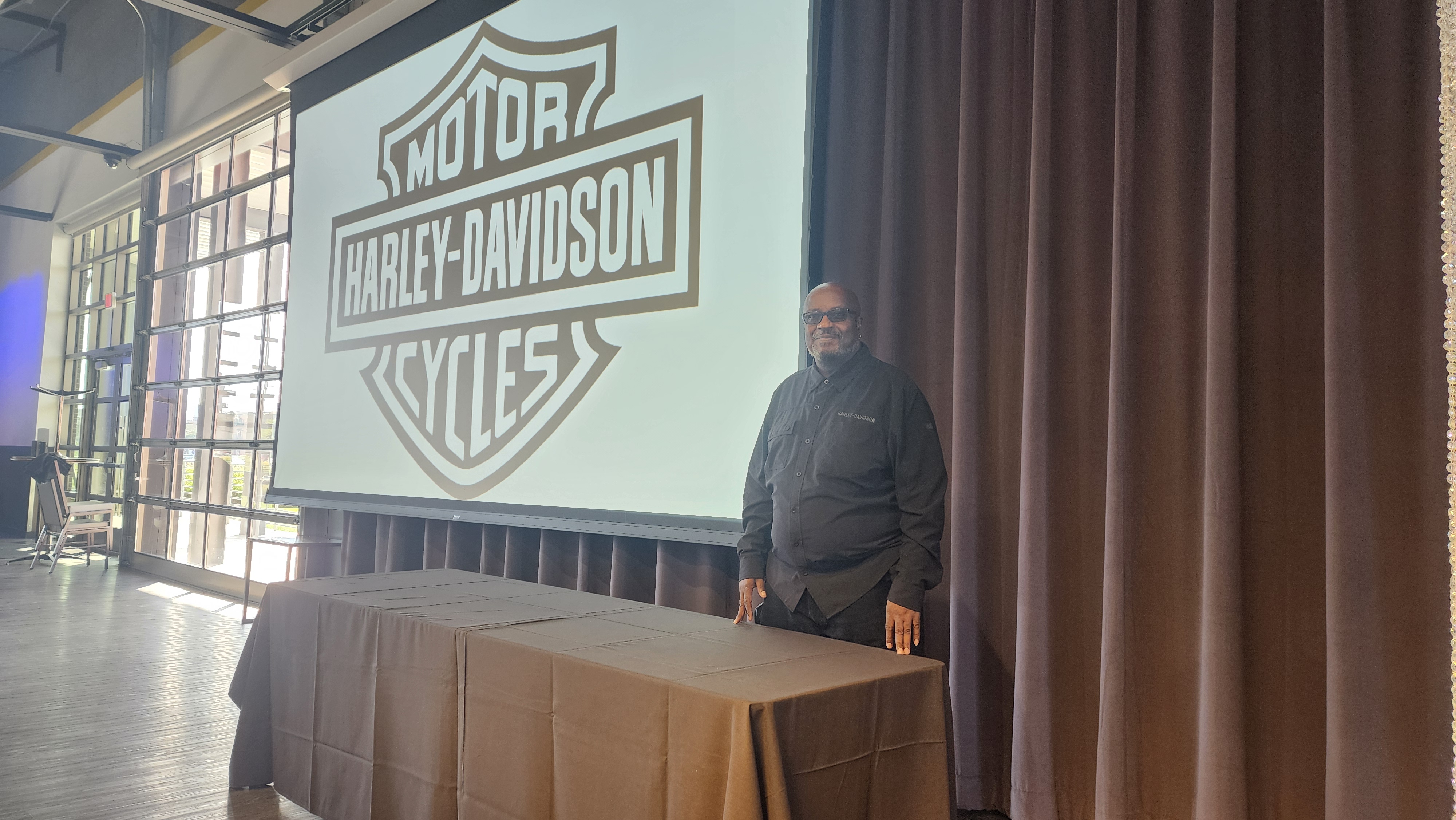 Speaker Bjorn Shuster stands at a Harley-Davidson podium in front of a PowerPoint presentation with an illustration of a motorcycle